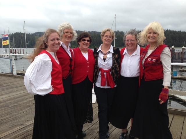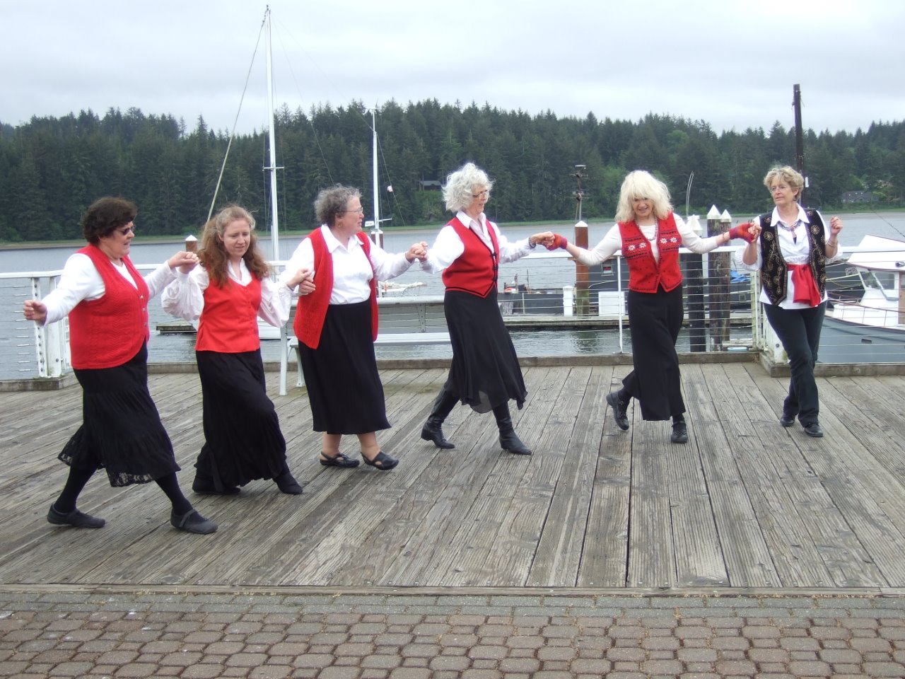 Here in Oregon, there are hot spots of International Dancing from Portland along the I-5 Corridor to Eugene, Creswell and Ashland. On the coast, we have some of the best International Dance going starting in Florence with the Oregon Coast International Dancers. Here they are dressed in village style Balkan colors of black, white and red in authentic, imitation costuming.