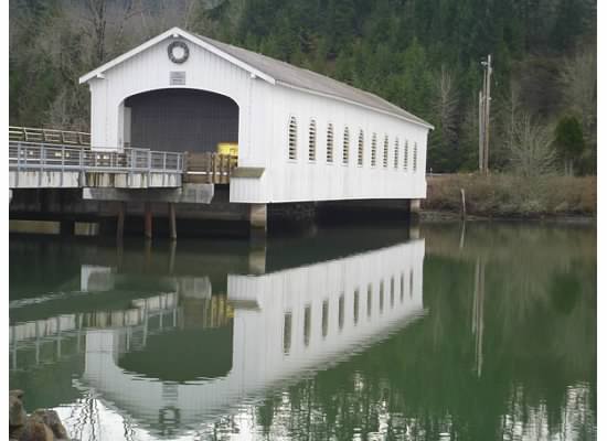 Oregon has 50 historic covered bridges which are among the greatest number in any state in the US. This one is particularly picturesque. Photo credit goes to me. I love the holiday wreath and especially the reflection in the water.