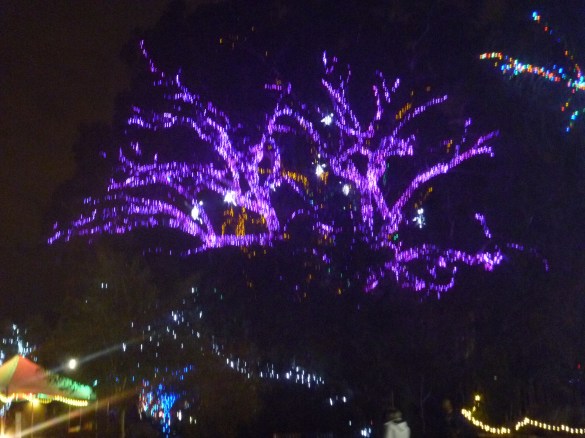 There were a variety of trees wrapped or strung with lights. On this one, the lights rolled off and on. I somehow managed to capture it when the lights were at their best.