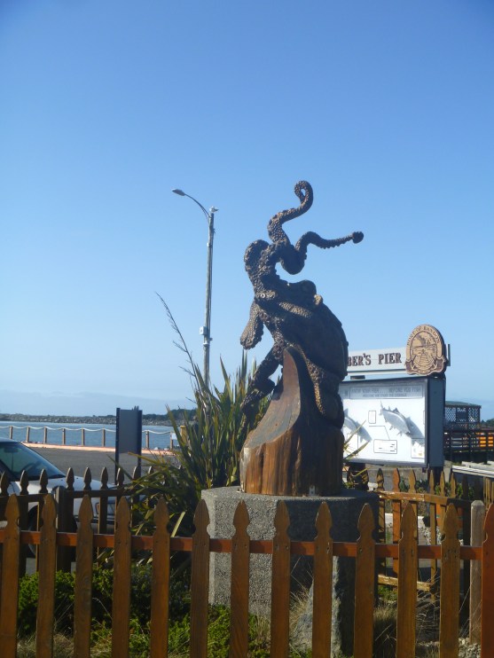 There are some wood, ocean-themed, carvings as you have seen in some of the photos. This is an octopus crawling up something. They are fascinating creatures and very ancient. There is one at the Hatfield Marine Science Center in Newport in a tank. It needs constant tending as it keeps trying to climb out of the tank. If you are there at the right time, you can see it being fed and eating.